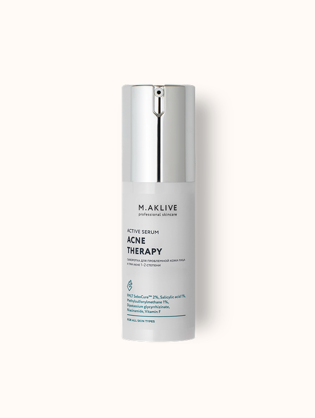 - Проникая в глубокие слои эпидермиса, инкапсулированная в липосомы смесь соли цинка, экстракта корней дикого ямса, азелаиновой кислоты, изофлавоноидов сои, пиридоксина НСl, ниацинамида, масла ши и церамидов снижает процесс закупоривания пор и образования комедонов, регулирует выработку себума и, как следствие, уменьшает деятельность Cutibacterium acnes, что приводит к сокращению воспалительных элементов.