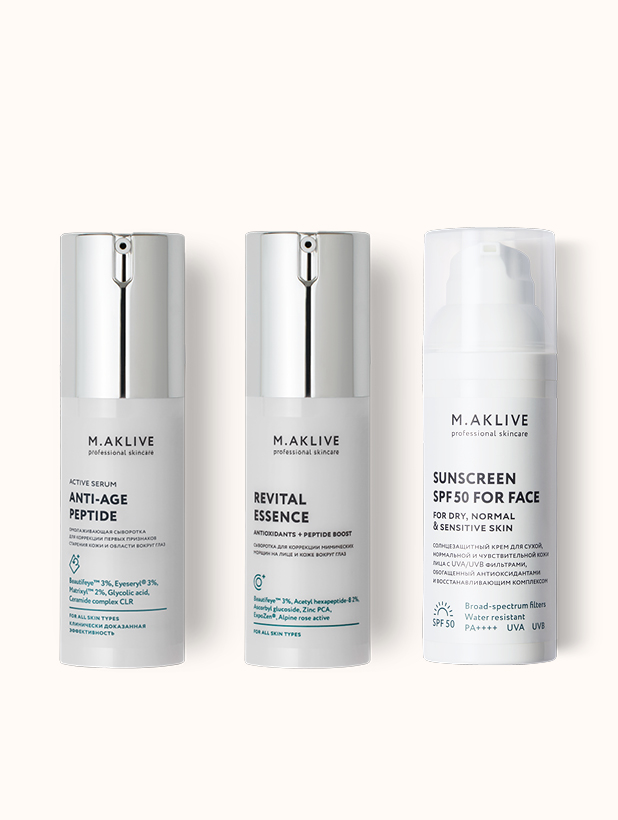 В зоне вокруг глаз снимают отечность и синеву, устраняя признаки усталости. Эссенция Антиоксиданты и пептидный буст предупреждает появление мимических морщин, а Сыворотка Анти Эйдж работает на сокращение глубины возрастных. Обе сыворотки можно сочетать в уходе, используя одну в утреннем, вторую - в вечернем ритуале ухода. Для защиты кожи от фотостарения и пигментации набор дополнен Солнцезащитным кремом SPF50 для сухой и нормальной кожи лица.